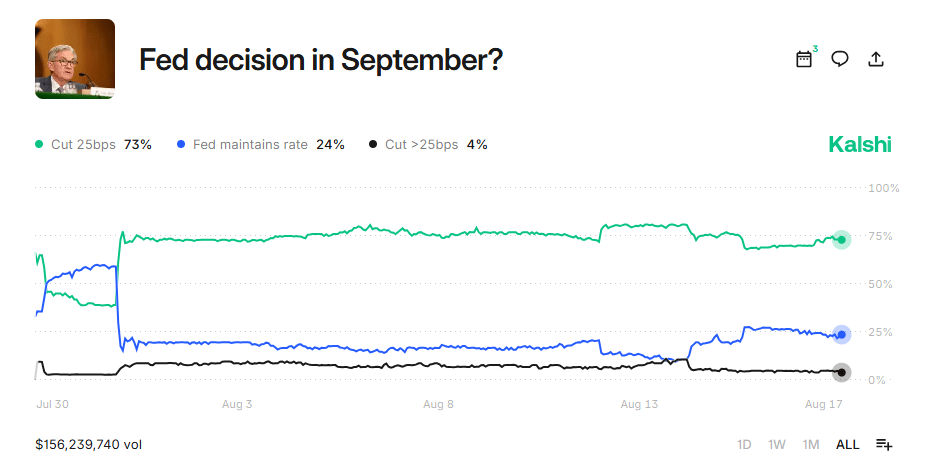 Kalshi traders are pricing in a 73% chance of 25bps rate cut in September