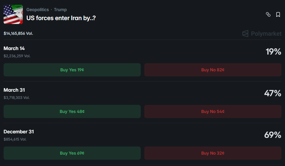 Polymarket traders expect the war to escalate further and are pricing in a 69% chance of US forces entering Iran this year.