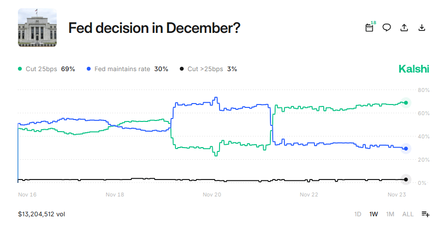 Kalshi traders are pricing in a 69% chance of a 25bps rate cut in December