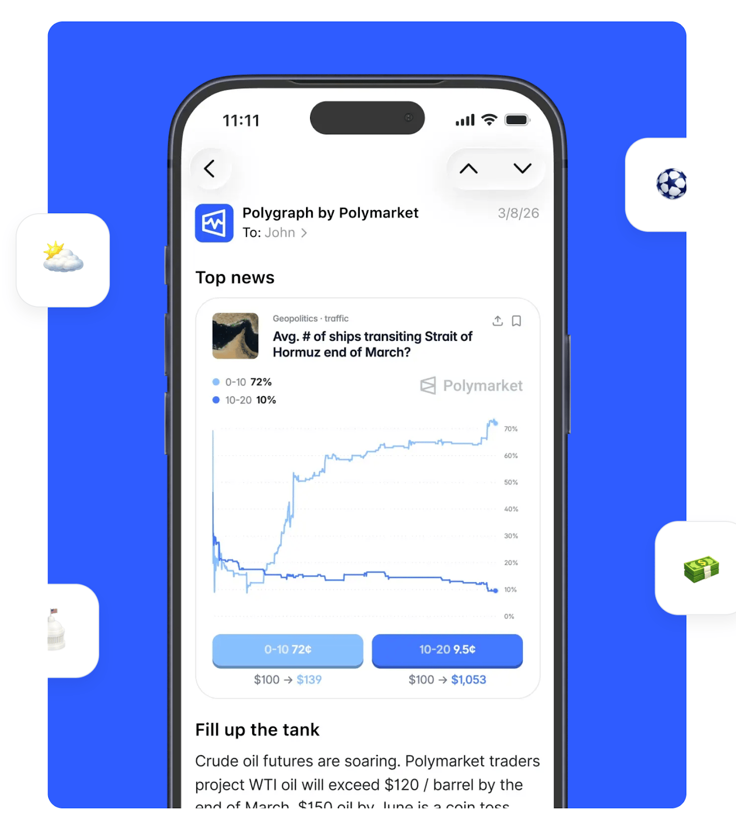 Each morning, get an email breaking down everything happening on Polymarket: the biggest shifts in odds, breaking news, new markets, whale moves, and much more.
