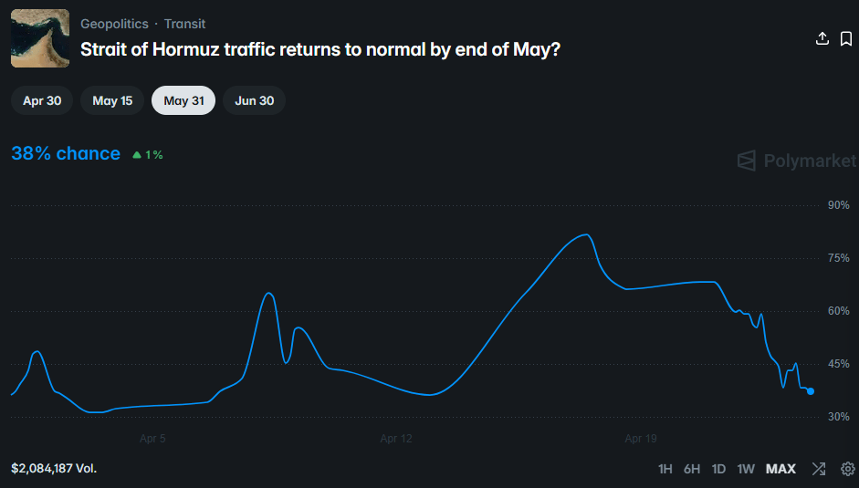 Polymarket traders are pricing in a 38% chance of Strait of Hormuz traffic being normal by the end of May