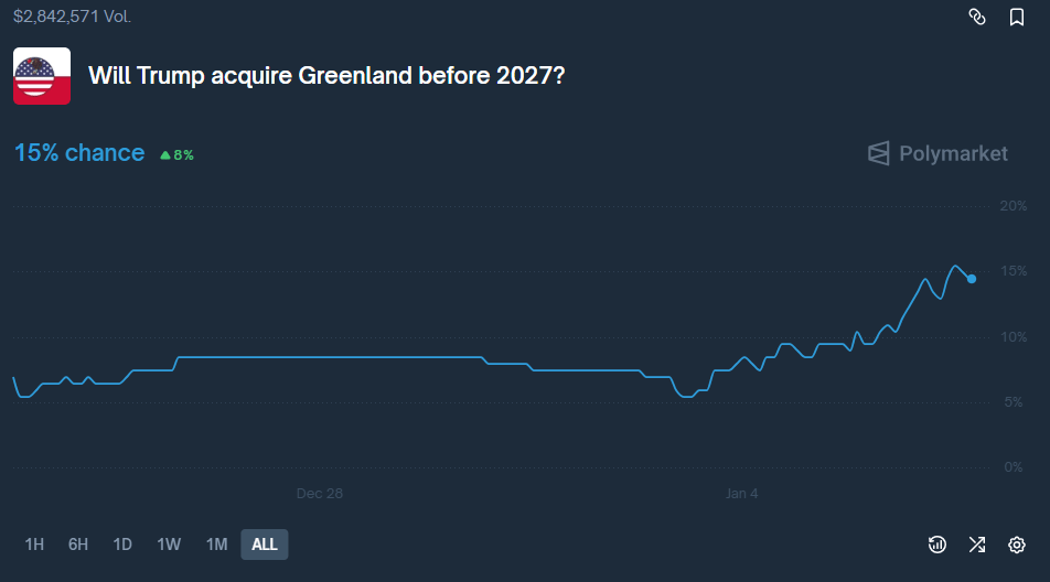 Polymarket traders are pricing in a 15% chance of Trump “acquiring” Greenland before 2027.